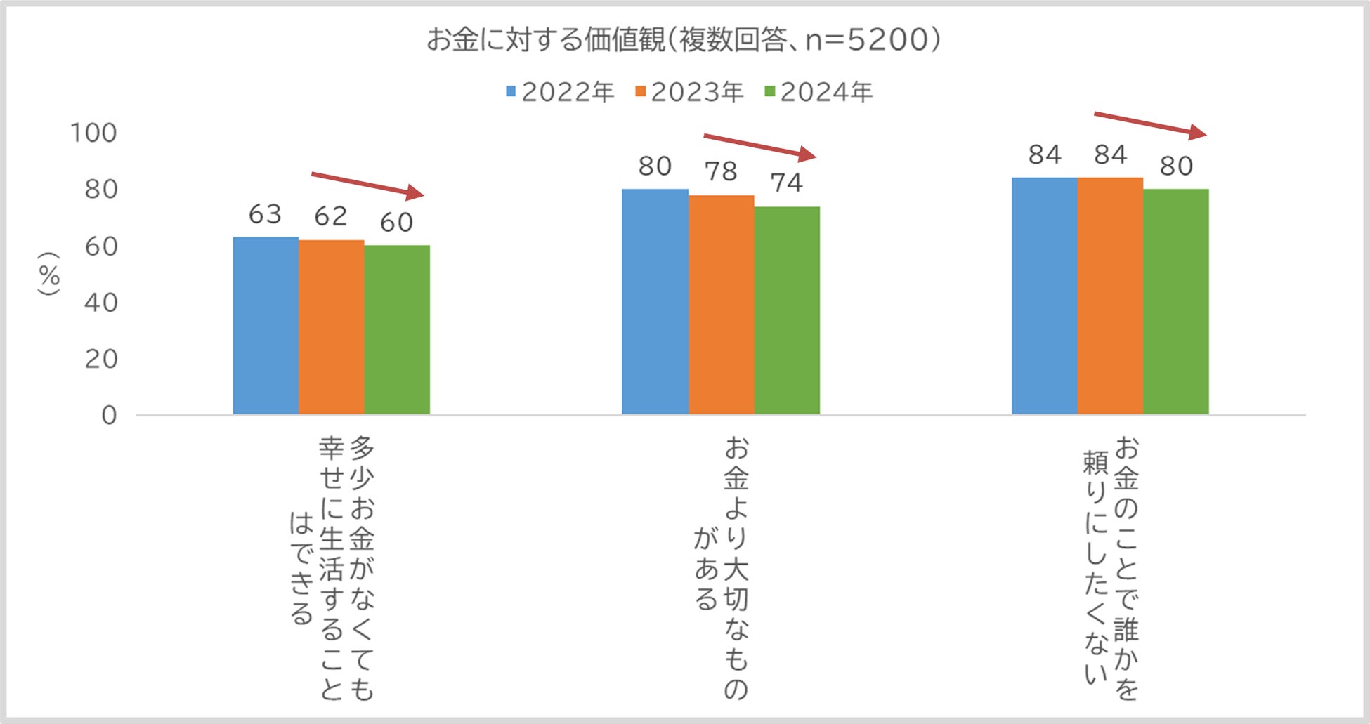 要因としては、景況悪化で生活に余裕を持てない層が増えた結果、「幸せに生活するにはお金が大切」という意識や、「お金のことで他人を頼らざるを得ないかもしれない」という懸念が広がっていることが考えられ、お金に対する価値の再実感が進んでいると言えます。