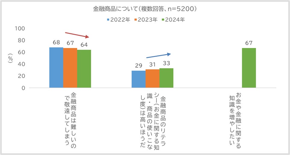 金融商品について聞いたところ、「金融商品は難しいので敬遠してしまう」と回答したのは、昨年より3%減少し、64%となりました。また、「金融商品のリテラシー(お金に関する知識・商品の使いこなし度)は高いほうだ」は昨年より2%増加し、33%となったことから、金融リテラシーは年々少しずつ増加していることが分かります。