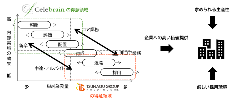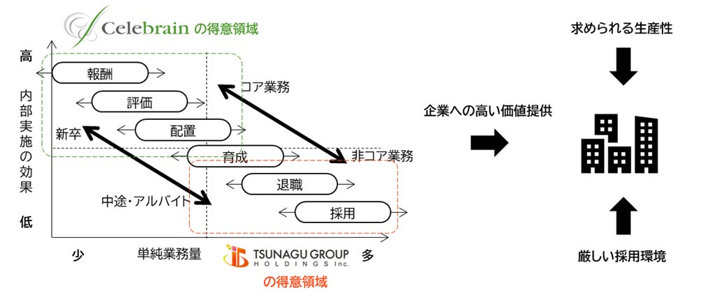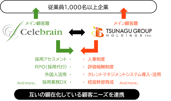 上記図1.にあるようにセレブレインとツナググループはHR領域上で得意領域が明確に棲み分けされており、カニバリゼーションは起きず、企業に対してシームレスに価値の高いソリューション提供が可能になっています。