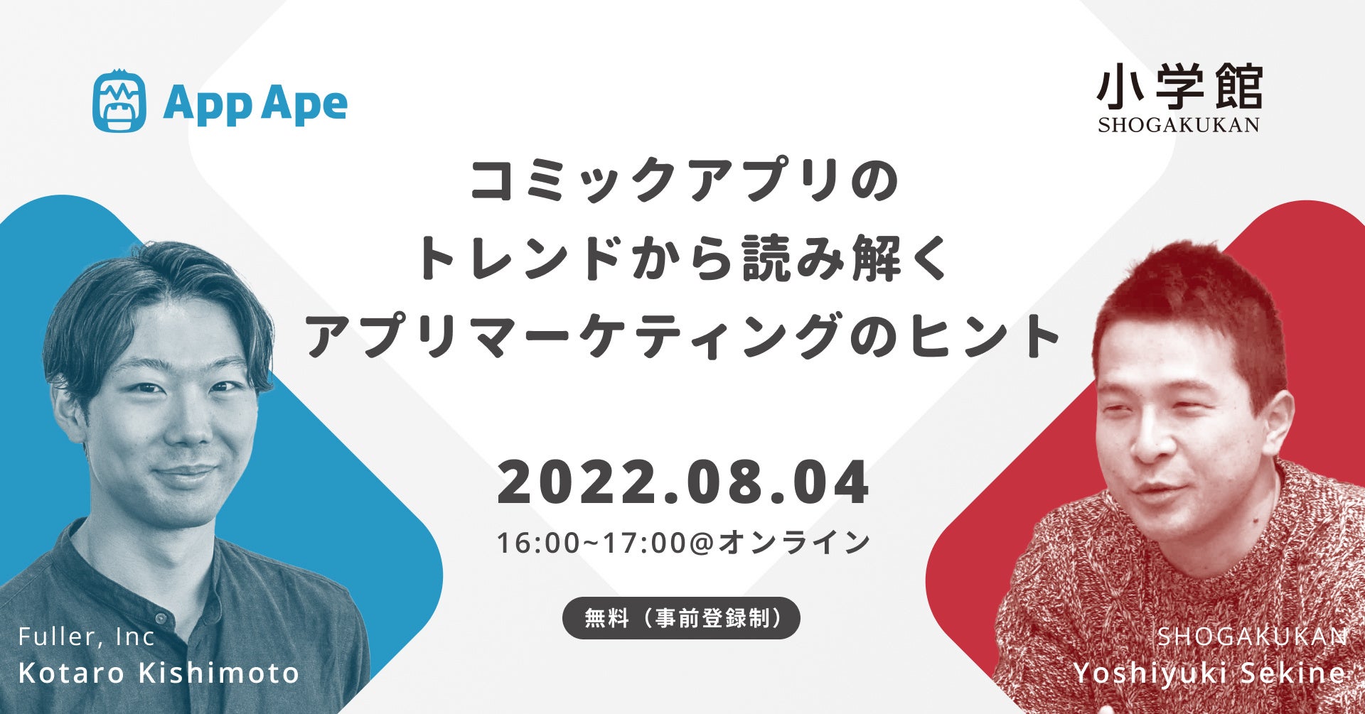 今回のセミナーでは、アプリ市場のトレンドに興味関心がある事業者様やアプリ内広告をご検討中の事業者様などに向け、フラーから「App Ape(アップ・エイプ)」データを用いて「コミック」「ファッション」アプリ市場トレンドを中心にご紹介。小学館からは、マンガアプリ「サンデーうぇぶり」「マンガワン」や女性メディア「CanCam.jp」、女性ファッション誌「Oggi.jp」等でリーチできる世代の特徴や、コラボ実施の取り組み事例をご紹介します。