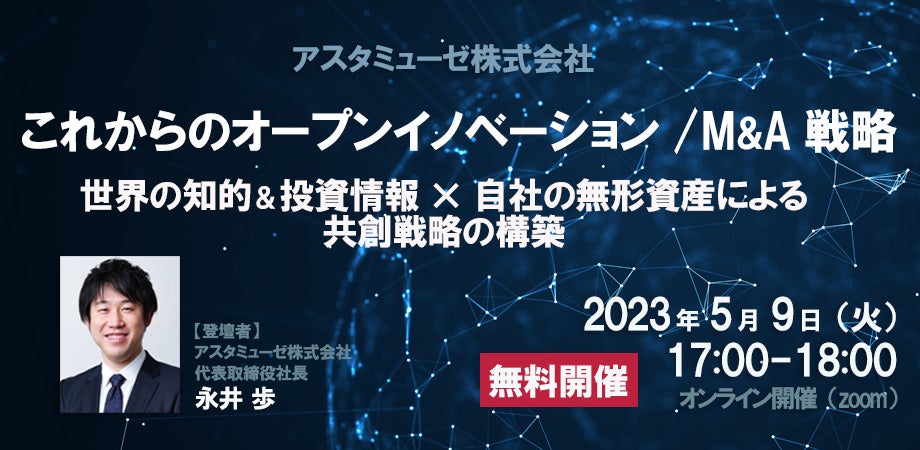 事業企画・経営企画部門向けの無料ウェビナー「これからのオープンイノベーション / M&A戦略 ~世界の知的&投資情報×自社の無形資産による共創戦略の構築~」を5月にも開催