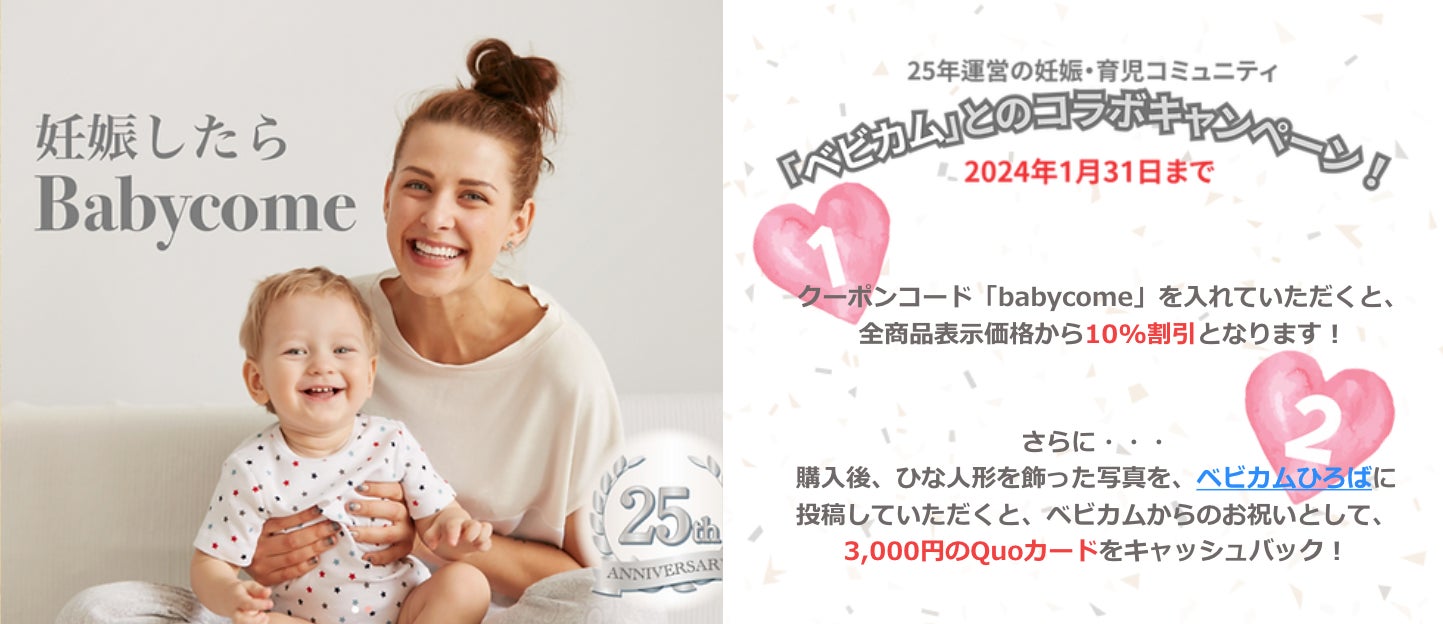ベビカム株式会社(本社所在地:東京都千代田区、代表取締役:安西正育)は、優雅なひな人形作りで評価が高い「人形の喜峯」とコラボレーションして、ひな祭りを家族で楽しくお祝いしていただけるように、特別キャンペーンを12月27日から開催します。