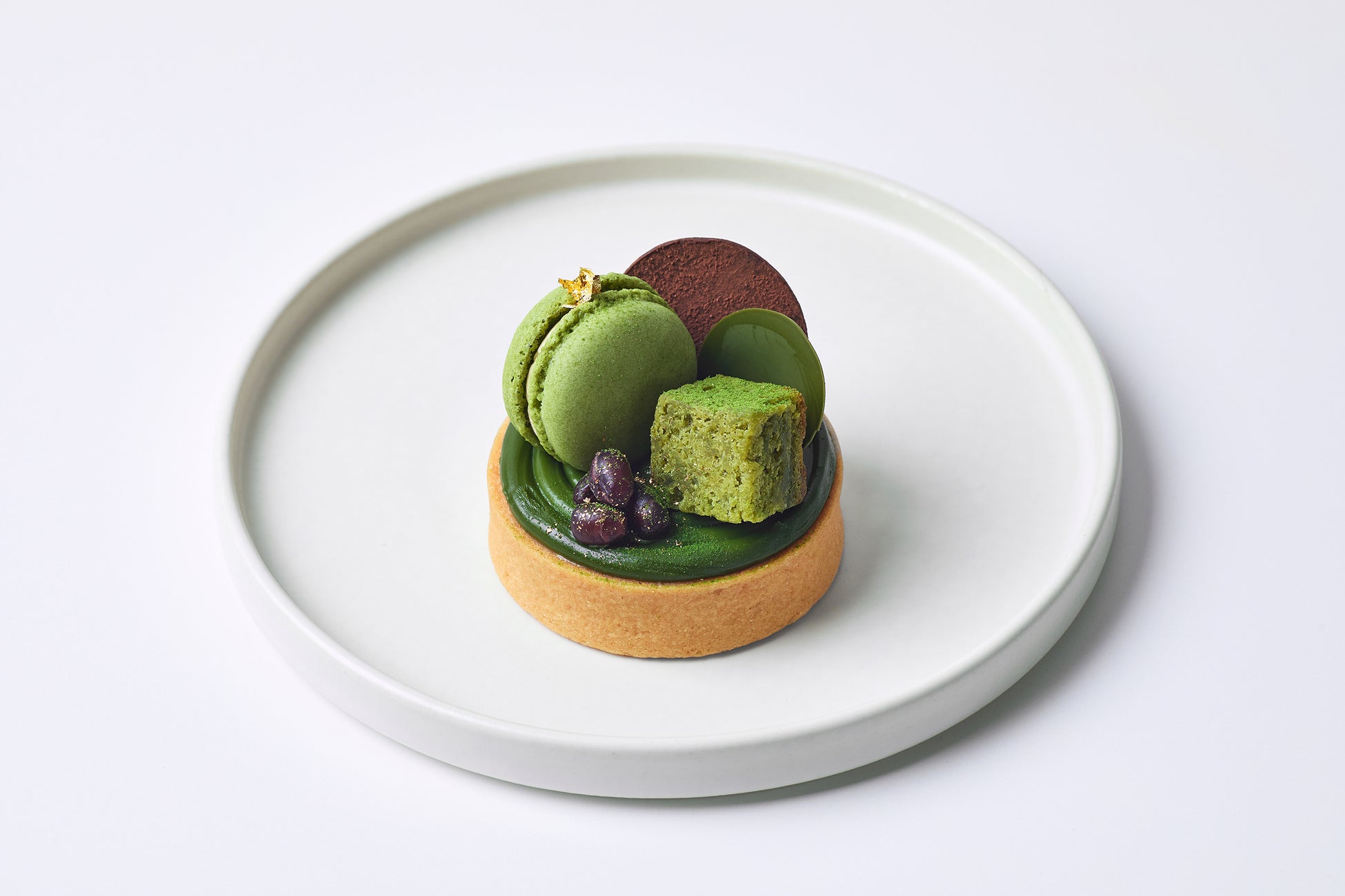 サクサクのタルトに、コク深い黒糖のムースと濃厚な抹茶の生チョコを重ね、トップには抹茶のマカロン、抹茶のガトーショコラをあしらいました。さまざまな食感と味わいで贅沢に抹茶をお楽しみいただけます。