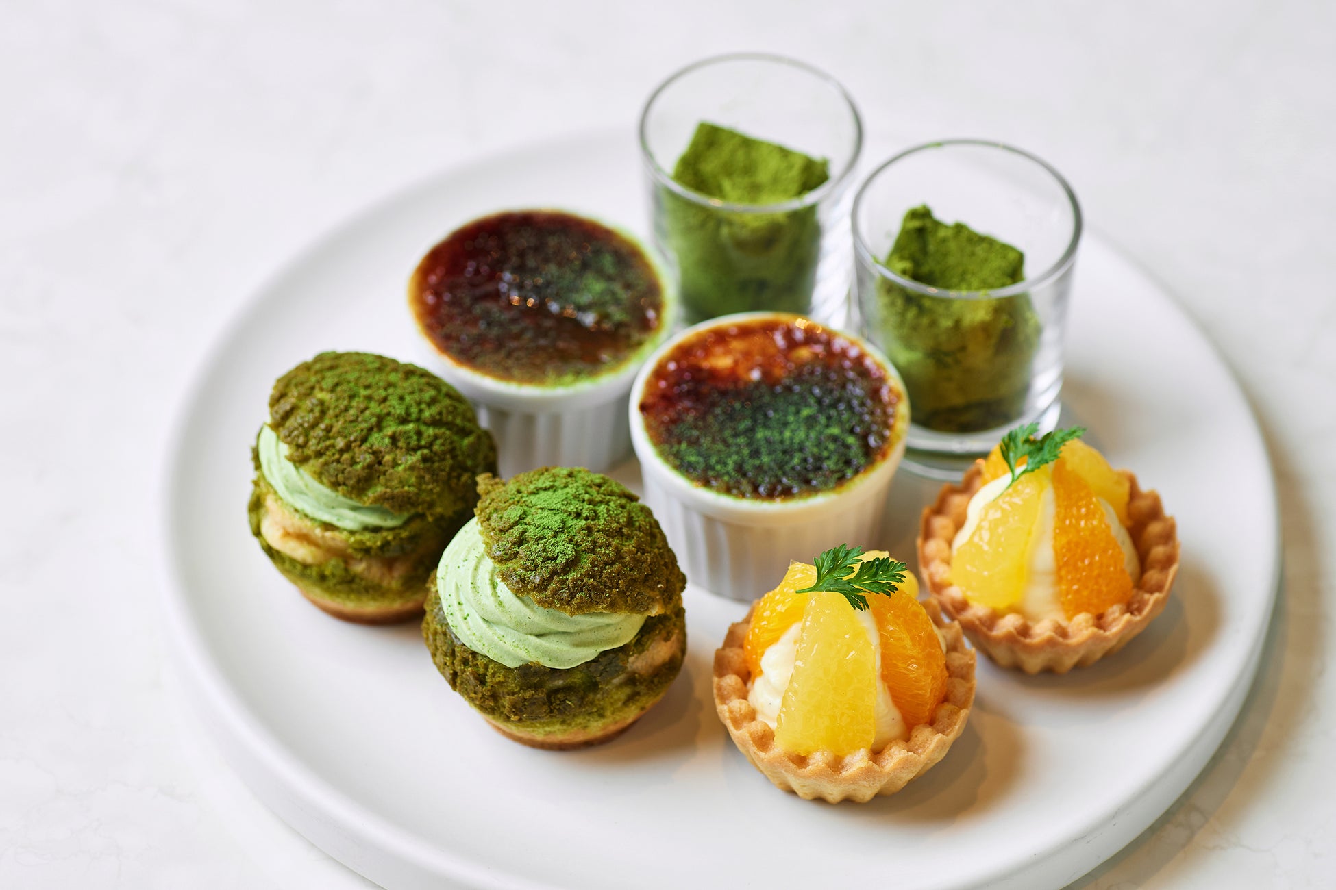 2段目:抹茶のわらび餅、抹茶のブリュレ、抹茶のシュークリーム、オレンジとグレープフルーツのタルト