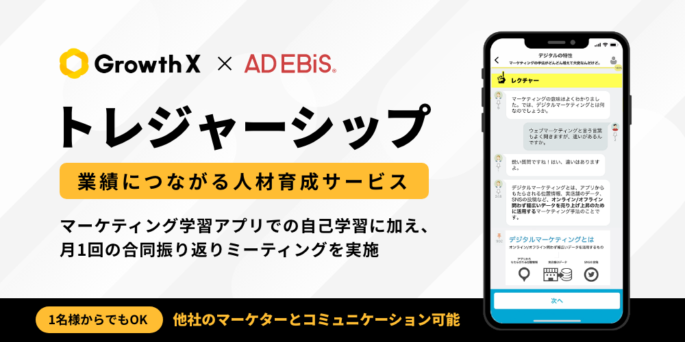 「トレジャーシップ」とは、グロースXが提供する「グロースXマーケティング」のコンテンツを、アドエビスユーザーに限り各企業1名様からご利用いただけるマーケティング人材育成サービスです。専用アプリでの自己学習に加え、月1回の合同振り返りミーティングにご参加いただきます。ミーティングでは他社マーケターとも交流できるため、新たな知識や気づきを得ながらスキルアップを目指せます。