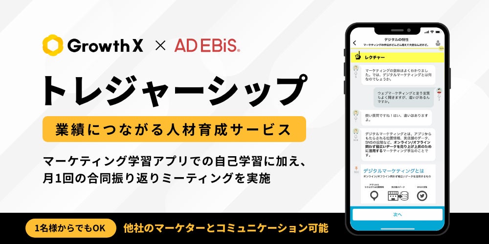 株式会社イルグルム(本社:大阪府大阪市北区 代表取締役:岩田 進)は、企業向けのマーケティングやAI、BtoB人材の育成SaaSサービスを提供する株式会社グロースX(本社:東京都渋谷区、代表取締役社長:津下本 耕太郎、以下「グロースX」)と、マーケティングプラットフォーム事業領域において業務提携を開始いたしました。その取り組みのひとつとして、広告効果測定プラットフォーム「アドエビス」のユーザー向けに、協奏型マーケティング人材育成サービス「トレジャーシップ」の提供を開始することをお知らせいたします。専用アプリの自己学習に加え、アドエビスユーザーである他社マーケターとの合同振り返りミーティングの実施など、マーケティング知識のインプットからアウトプットまで一気通貫でサポートいたします。