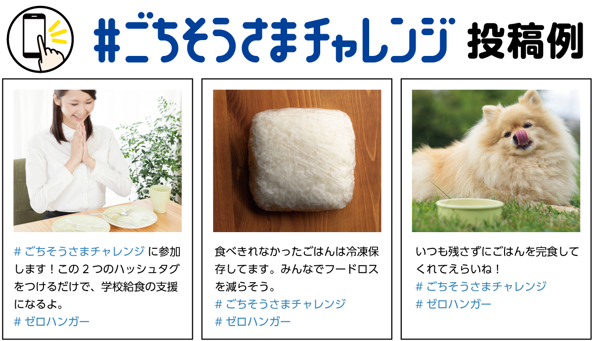内 容:「賢く買う」「使い切る」「食べ切る」などの食品ロス削減につながる行動や「ごちそうさまポーズ」を、2つのハッシュタグ「#ごちそうさまチャレンジ」「#ゼロハンガー」をつけてSNSに投稿すると、1投稿につき120円が協力企業により国連WFPの学校給食支援に寄付されます。
