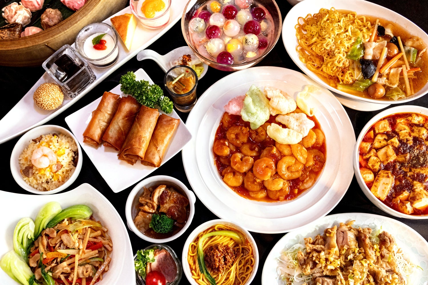 帆立粥、くらげの和え物、よだれ鶏、紅茶鴨の山椒風味、五目炒飯、焼きそば麺、八宝菜、花椒香る麻婆豆腐、海老チリソース、青椒肉絲、蟹入りふわふわ卵、イカとセロリの海醤ソース、豚の角煮 八角風味、春巻き、若鶏の唐揚げ 油淋ソース、各種飲茶 ほか 30種類以上