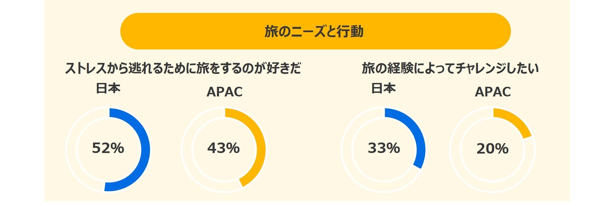 旅の目的について調査をしたところ、日本人の半数以上(52%)は、「日常のストレスから逃れるために旅をするのが好きだ」と回答しています。また、33%が「旅の経験によってチャレンジしたい」と回答しており、これは、APAC全体平均の20%を大きく上回ります。日本の旅行者は旅に対して日常から離れ、チャレンジすることを求めている傾向が伺えます。