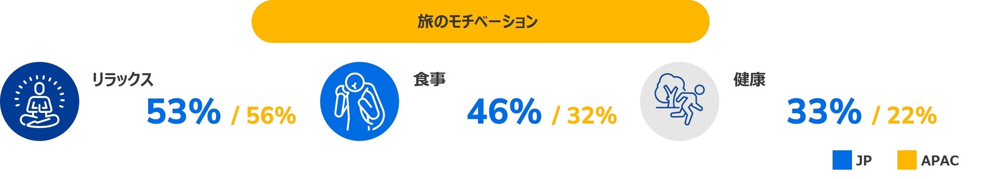旅のモチベ―ションについて調査したところ、日本で最も多かった回答は「リラックス」(53%)で、半数以上が安らぎのある休暇を求めていることが明らかになりました。「食事」「健康」はAPAC全体平均と比較して高く、旅に対して総合的な楽しみをモチベーションとし、心身ともに活性化するアクティビティを求めていることが伺えます。