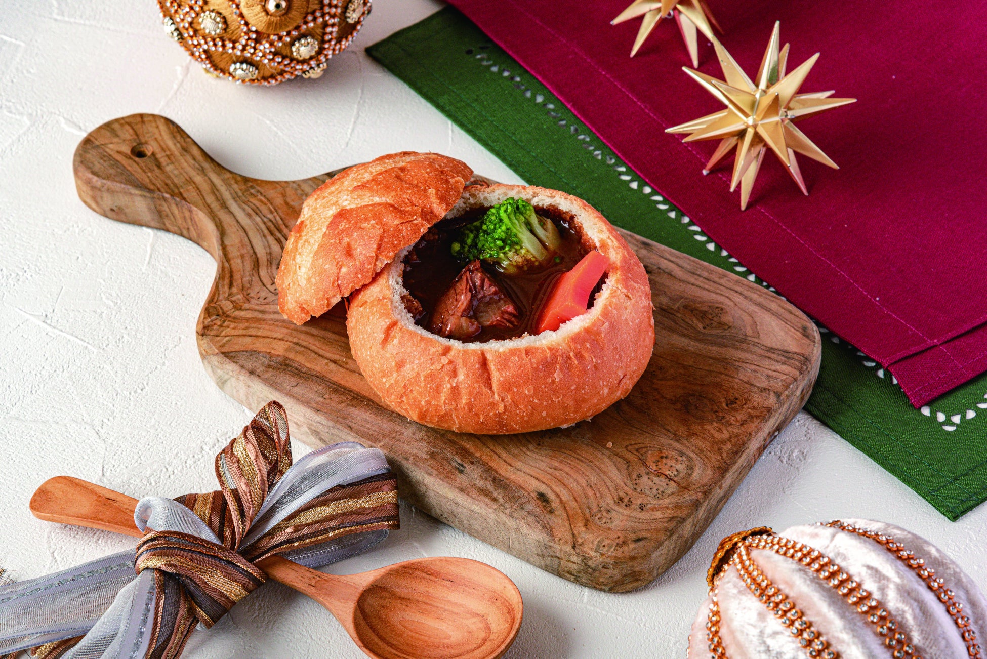赤ワインでじっくり柔らかくなるまで煮込んだ牛肉のビーフシチューを、器ごとお召し上がりいただけるパンのお皿でご提供します。