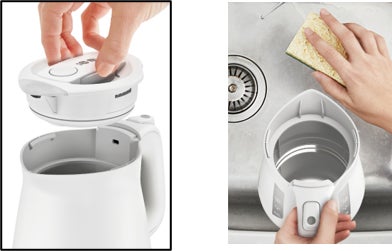 さらに、スリムな注ぎ口で湯量をコントロールしやすくなり、簡単に美味しいドリップコーヒーを淹れることが可能です。本体の両側にある目盛り付きの窓で、湯量や沸騰状態がひと目で確認できます。また、安心機能も充実しています。うっかり倒れてもお湯がこぼれにくい「お湯漏れロック機能」や、やけどのリスクを抑える省スチーム設計のほか、オートオフ機能、空焚き防止機能も付いているので、安心してお使いいただけます。衛生面では、注ぎ口にカバーが付いているのでほこりが入りにくく、水あかが付きにくい「ウルトラポリッシュ底面」を採用しているので、こまめなお手入れなしでも清潔に保ちます。フタは取り外し可能で口が広く、内部に手やスポンジを入れて簡単にお手入れできます。