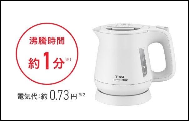 あっという間にすぐに沸く「アプレシア ロック 0.8L」は、カップ1杯分(140mL)なら約1分(※2)で沸騰できるので、忙しい朝や急な来客でも大丈夫。電気代も1カップわずか約0.73円*と家計にも優しい電気ケトルです。