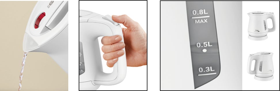スリムな注ぎ口と持ちやすいハンドルで湯量をコントロールしやすく、ドリップコーヒーも淹れやすい。本体の両側にある目盛り付きの窓で、湯量や沸騰状態がひと目で確認できます。