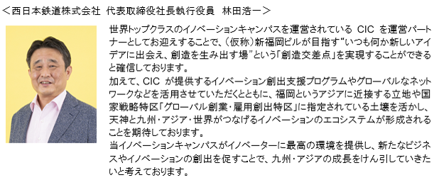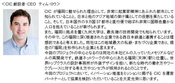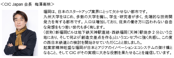 (仮称)新福岡ビルは地下鉄天神駅直結・西鉄福岡(天神)駅徒歩2分という立地にあり、そして何より「創造交差点を作る」というコンセプトに強く共感し、この度の西日本鉄道との検討を開始させていただくことと致しました。起業家精神旺盛な福岡が日本とアジアのイノベーションエコシステムの架け橋となること、そしてCICがその実現に大きな役割を果たせることを確信しています。