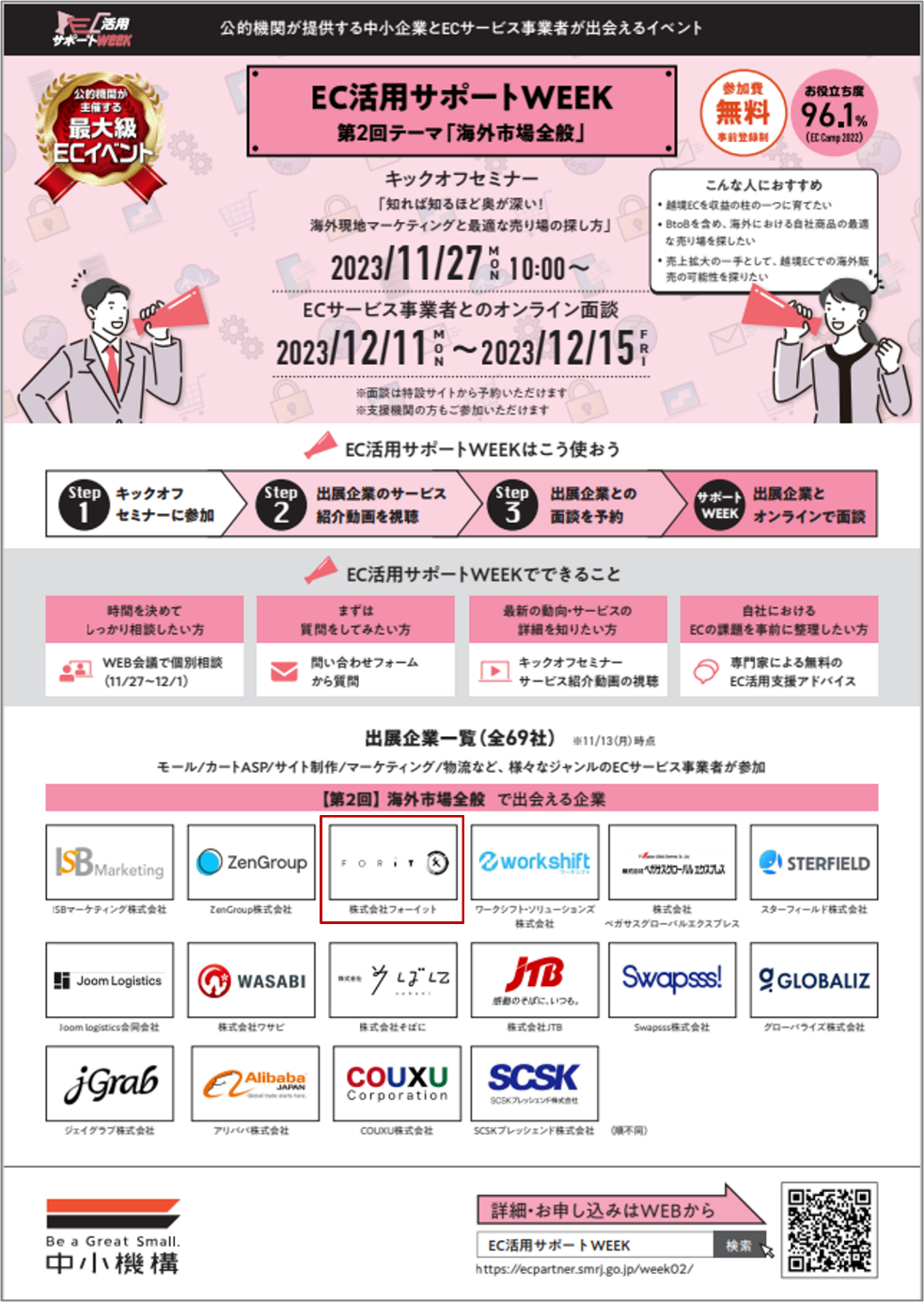 独立行政法人中小企業基盤整備機構(以下、中小機構)のEC活用支援パートナー*¹である株式会社フォーイットは、来る2023/12/11(月)~12/15(金)に開催される「EC活用サポートWEEK」へ越境EC支援企業として出展いたします。