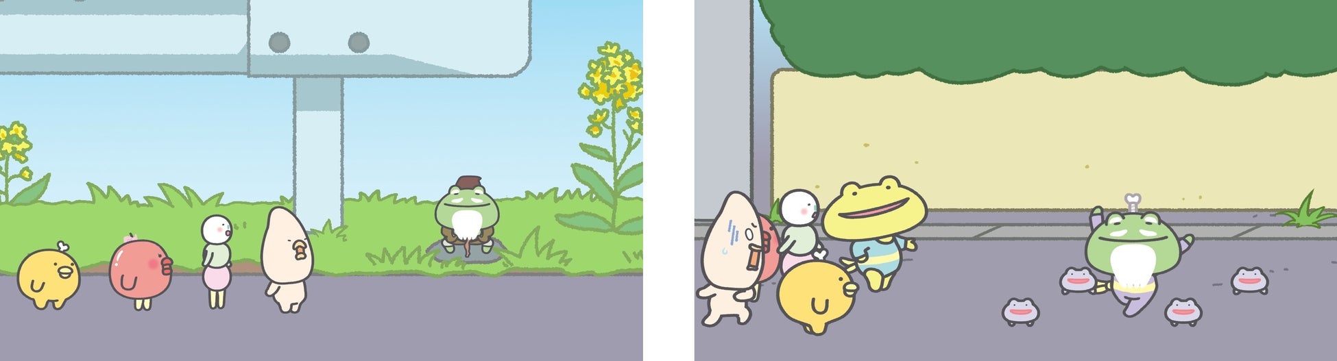 今日はつむぎちゃんの家庭訪問。スキップガエル先生もいつになくあわてた様子。「会いに来るはずの師匠が来ない」と家を飛び出します。ほねチキンたちも後を追いますが…