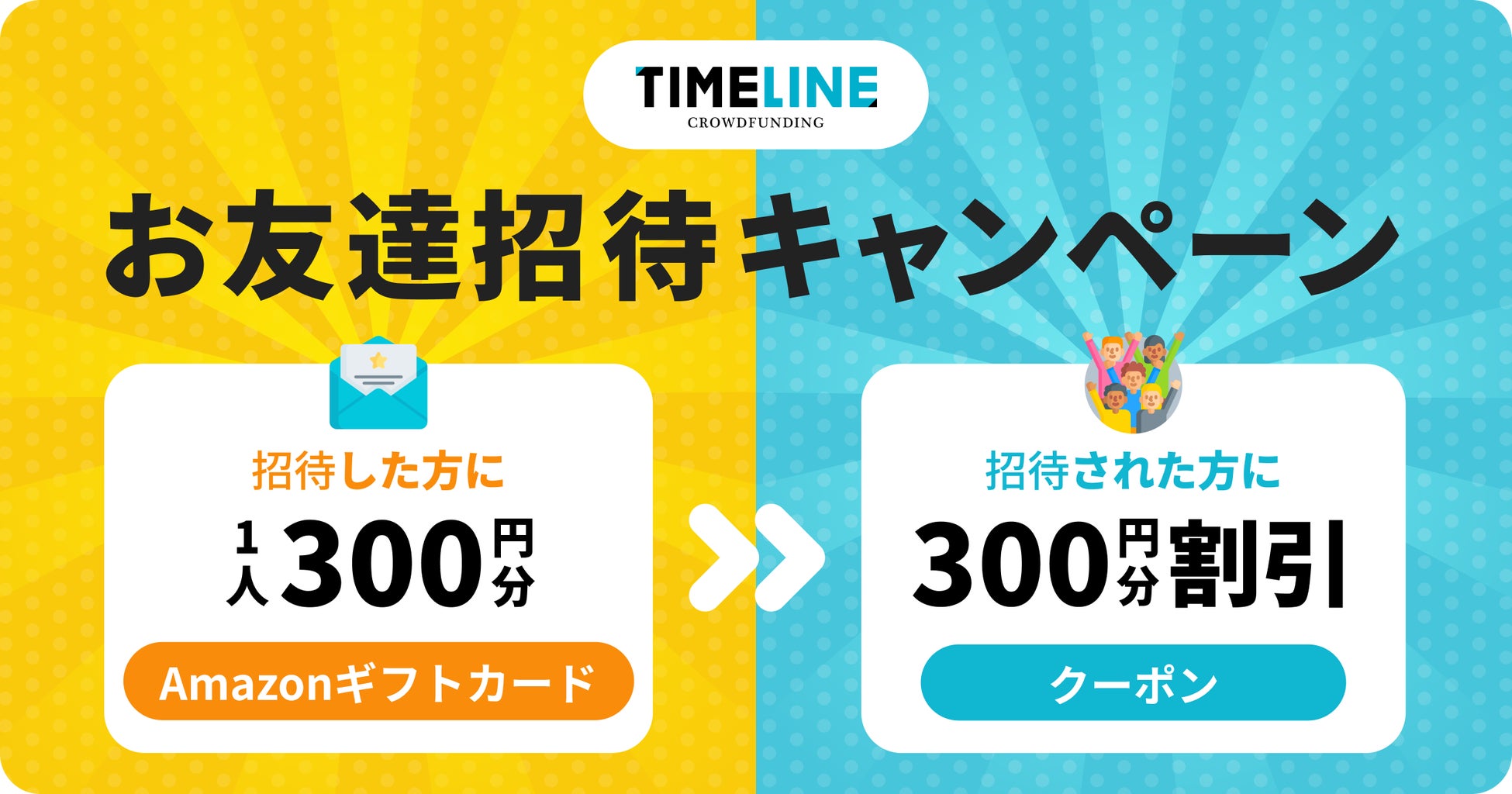 本キャンペーンは、『TIMELINEクラウドファンディング』に会員登録がお済みの方が、期間中にお友達を招待いただき、会員登録とプロジェクトへのご支援を完了した場合、お友達おひとりにつき300円分のAmazonギフトカードを進呈します。最大10名の方をご招待いただけます。また招待されたお友達も、ご支援時に招待コードを入力いただくと、プロジェクト支援金額にその場で300円分の割引が適用されます。招待した方、招待された方それぞれにお得な特典があるこの機会に、ぜひご参加ください。