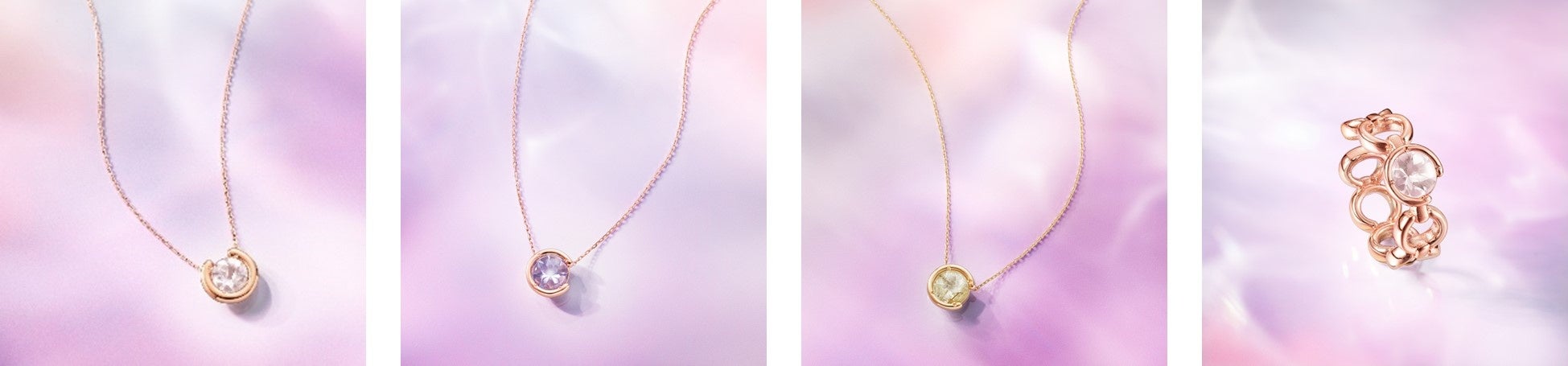 第2弾となる今回は、Canal 4℃の「C」をアイコニックに表現し、澄んだ水のような瑞々しい輝きを放つオリジナルカットを施した天然石をセットしました。ナチュラルで優しいカラーのローズクォーツやアメジスト、ルチルクォーツの天然石を配した美しいジュエリーが、上品で瑞々しい美しさを添えてくれます。