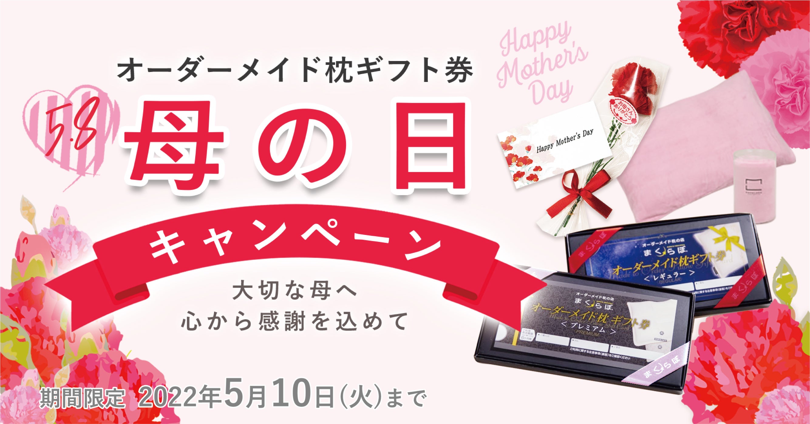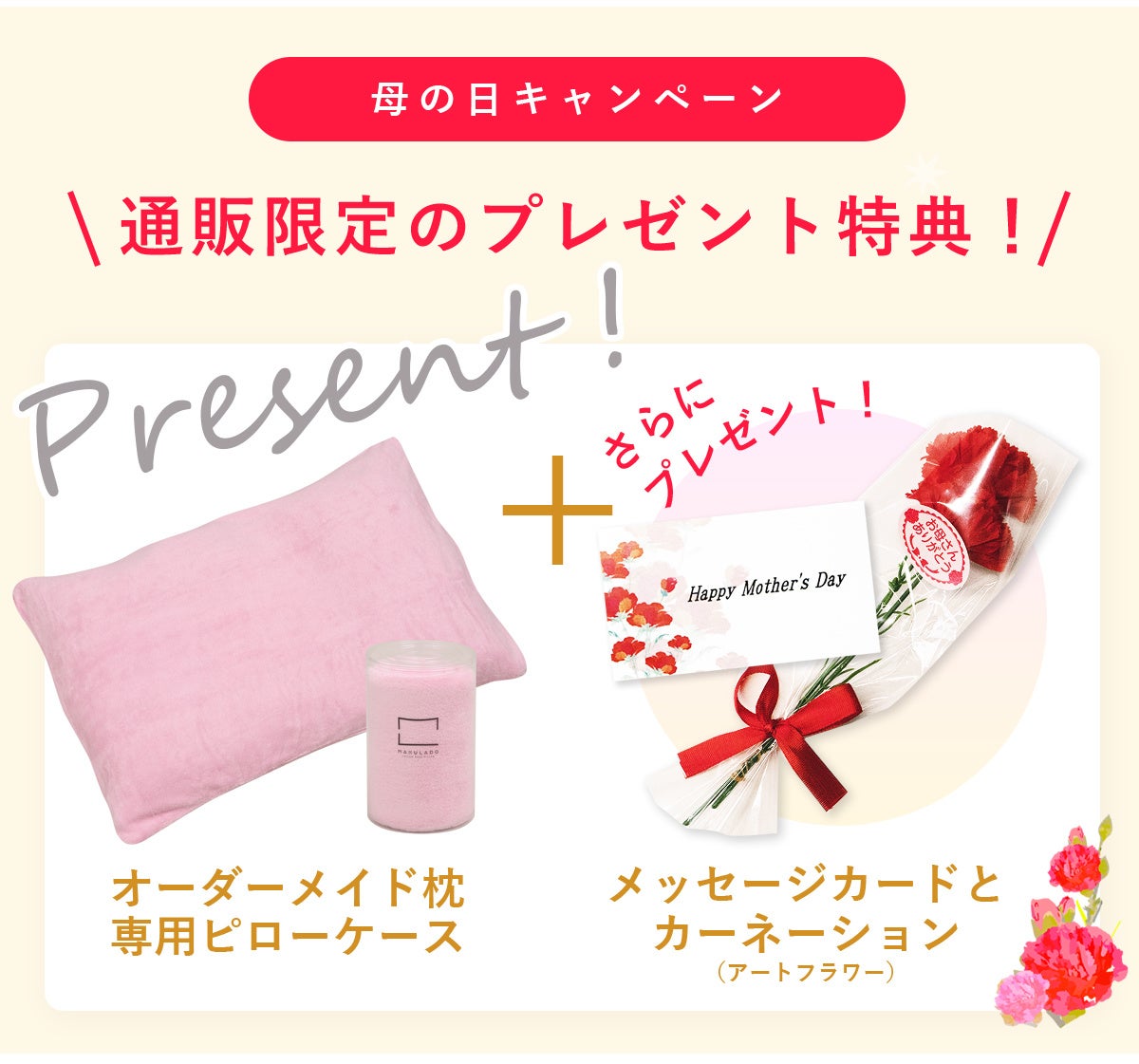 オーダーメイド枕ギフト券に加えて、専用ピローケース、ミニカーネーションやメッセージカードなどの特典がついたギフトを、お得にお買い求めいただける今だけの特別なキャンペーンです。