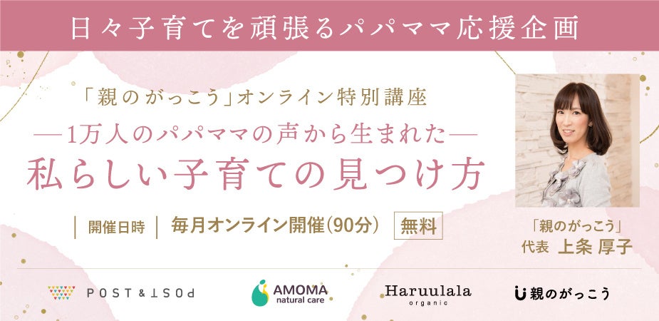 ポストアンドポスト株式会社(福岡県福岡市、代表 吉田照喜|以下ポスポス)は、自社のお客さまの子育て支援を目的に、「親のがっこう」(ママライフバランス株式会社|愛知県名古屋市、代表 上条厚子)と連携し、子育て講座の無償提供を開始しました。