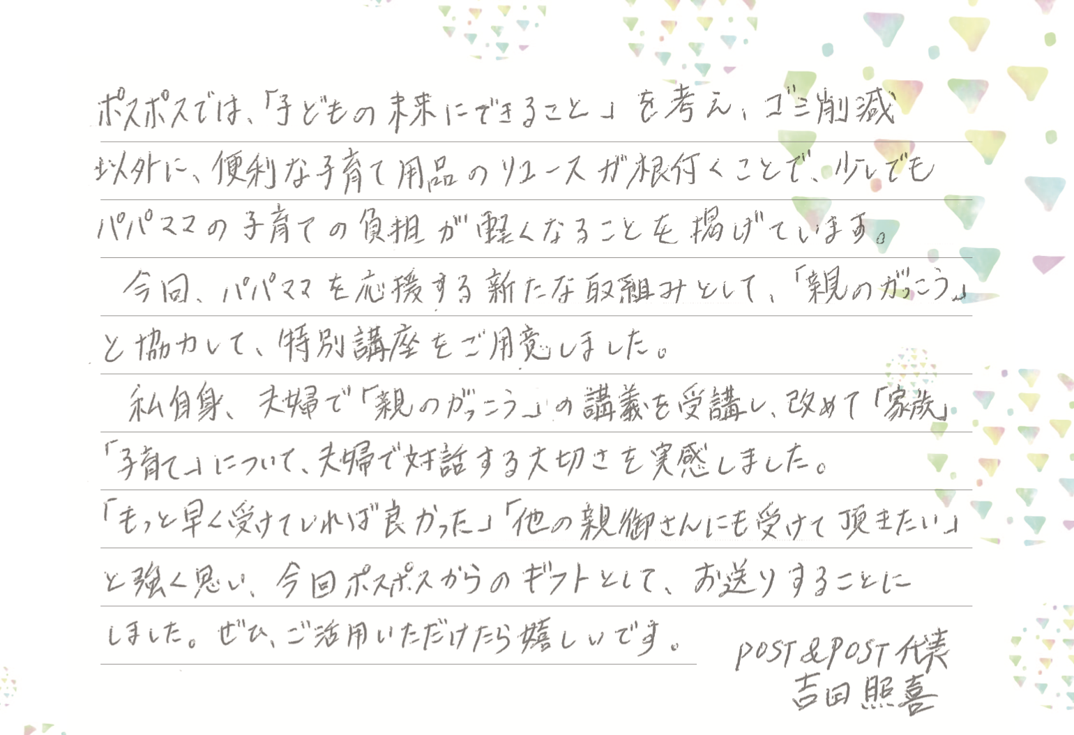 私自身が「親のがっこう」を受講し「子育て」について夫婦で対話する大切さを実感し、一人でも多くの親御さんに受けていただきたいと思い、今回GIFTとしてお客様にお送りすることに致しました。この取り組みを通して、子どもの未来のためによりお役立てればと思っております。