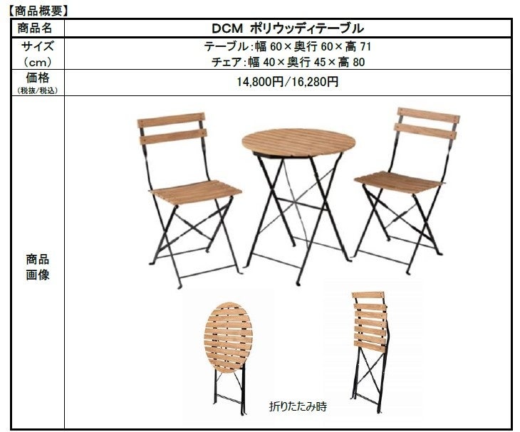 お庭など屋外でくつろぐ際に、木製のテーブルやチェア が 人気です。しかし、木製のものは屋外に置いている間に腐食したり、汚れが付着しやすいなど、メンテナンスが大変との声をいだだいていました。そこで、今回DCMは、木の代わりに ポリウッディ素材を使用し、自然のぬくもりが感じられる天然木のような風合いの「DCM ポリウッディテーブル 3 点セット」を発売します。天然木と比べて腐食しにくく、お手入れも簡単です。 しかも軽量で折畳みもできるので、収納や持ち運びに便利です。