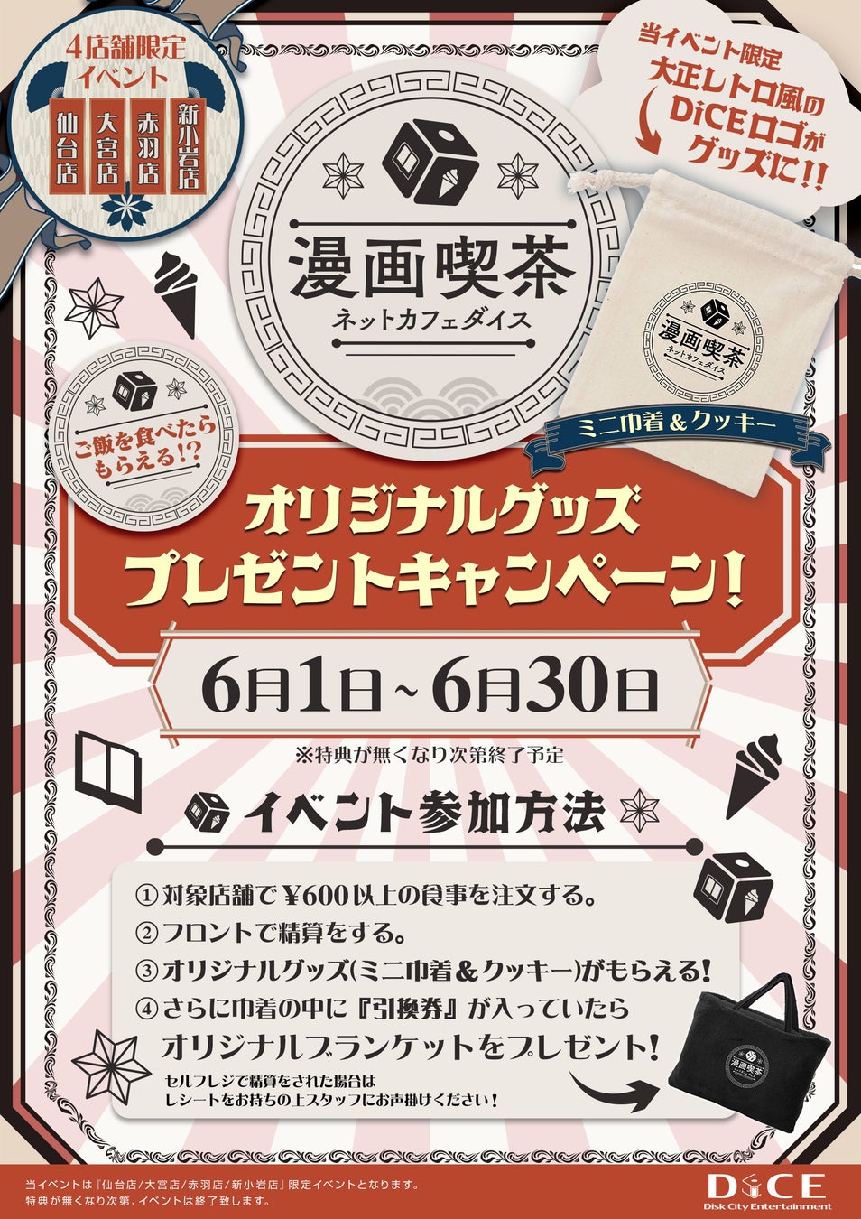 開催店舗:インターネットカフェ「DiCE(ダイス)」仙台店、大宮店、赤羽店、新小岩店の4店舗限定です。