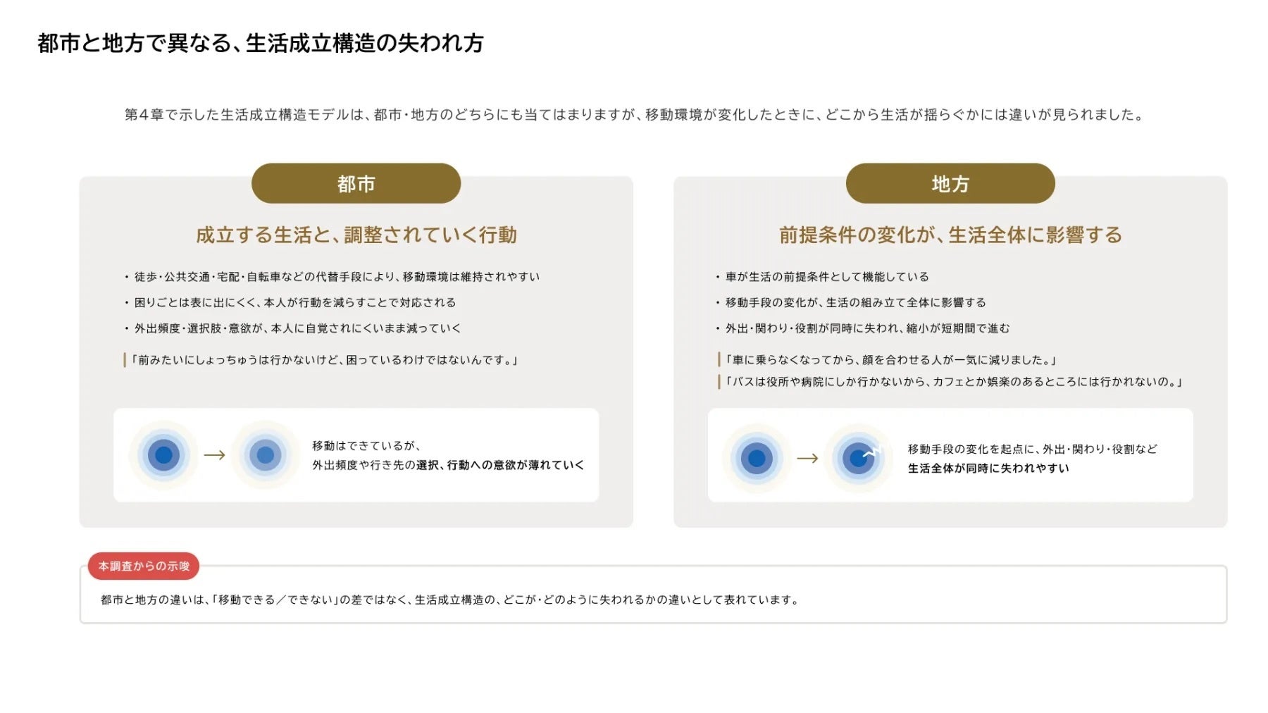 多くの施策やサービスは、「移動できなくなった後」を起点に設計されがちです。 しかし本調査からは、モビリティは単に場所を移動する手段ではなく、生活がどのように成り立つかに深く関わっていることが見えてきました。 移動環境が整っていることで、人は「行ける」だけでなく、