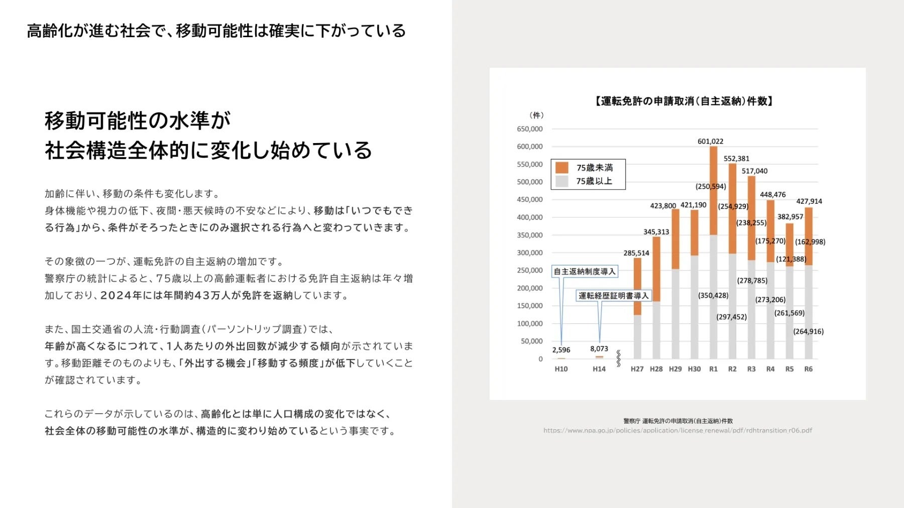 高齢化の進展により、免許返納や移動手段の見直しが多くの人にとって現実的なテーマになっている