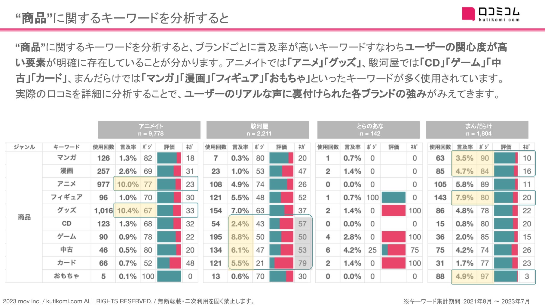 “商品”に関するキーワードを分析すると、ブランドごとに言及率が高いキーワードすなわちユーザーの関心度が高い要素が明確に存在していることが分かります。アニメイトでは「アニメ」「グッズ」、駿河屋では「CD」「ゲーム」「中古」「カード」、まんだらけでは「マンガ」「漫画」「フィギュア」「おもちゃ」といったキーワードが多く使用されています。実際の口コミを詳細に分析することで、ユーザーのリアルな声に裏付けられた各ブランドの強みがみえてきます。