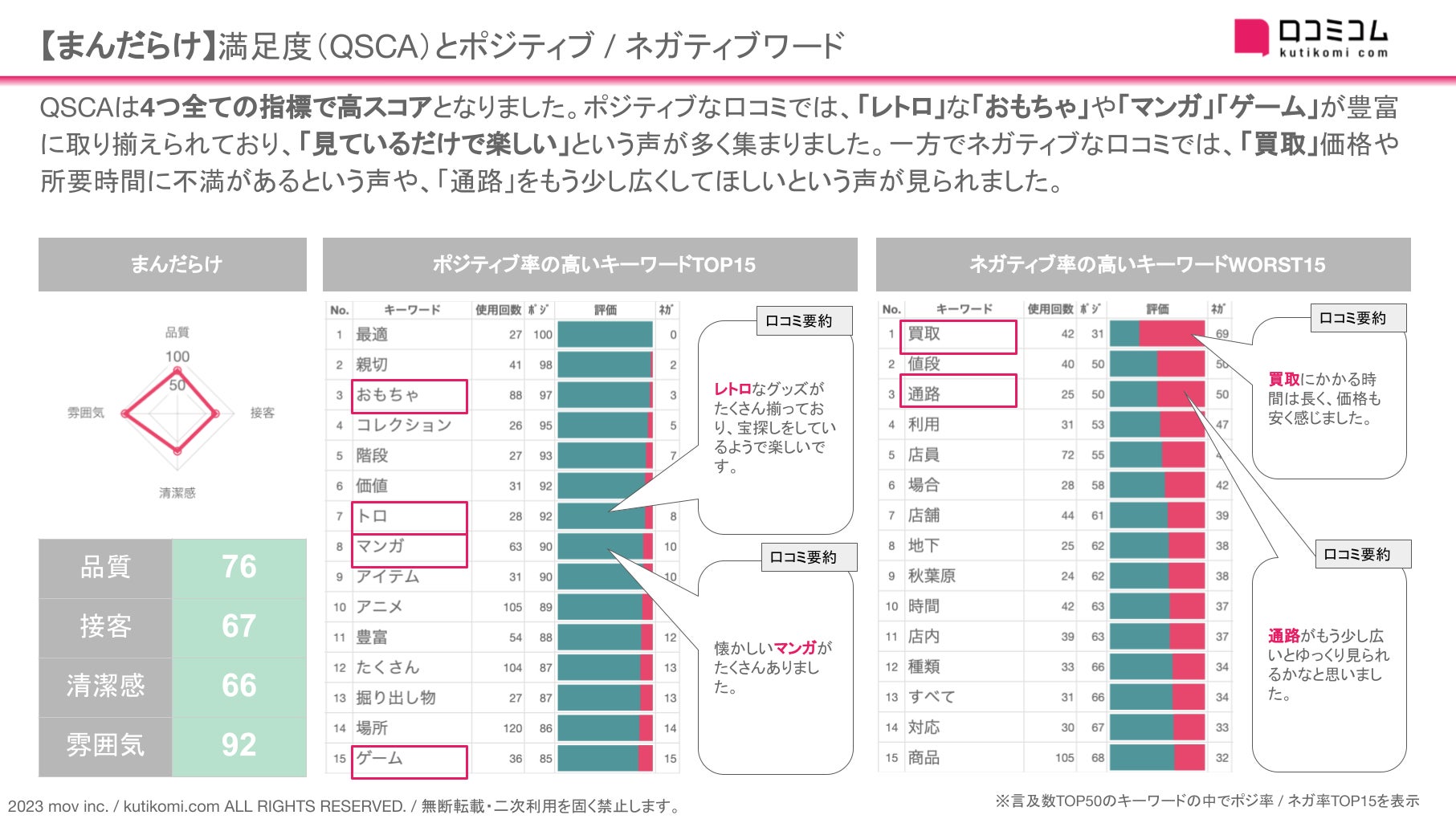 今回は、このAI解析を用いて【まんだらけ】 のQSCA・ポジ / ネガキーワードを確認しました。