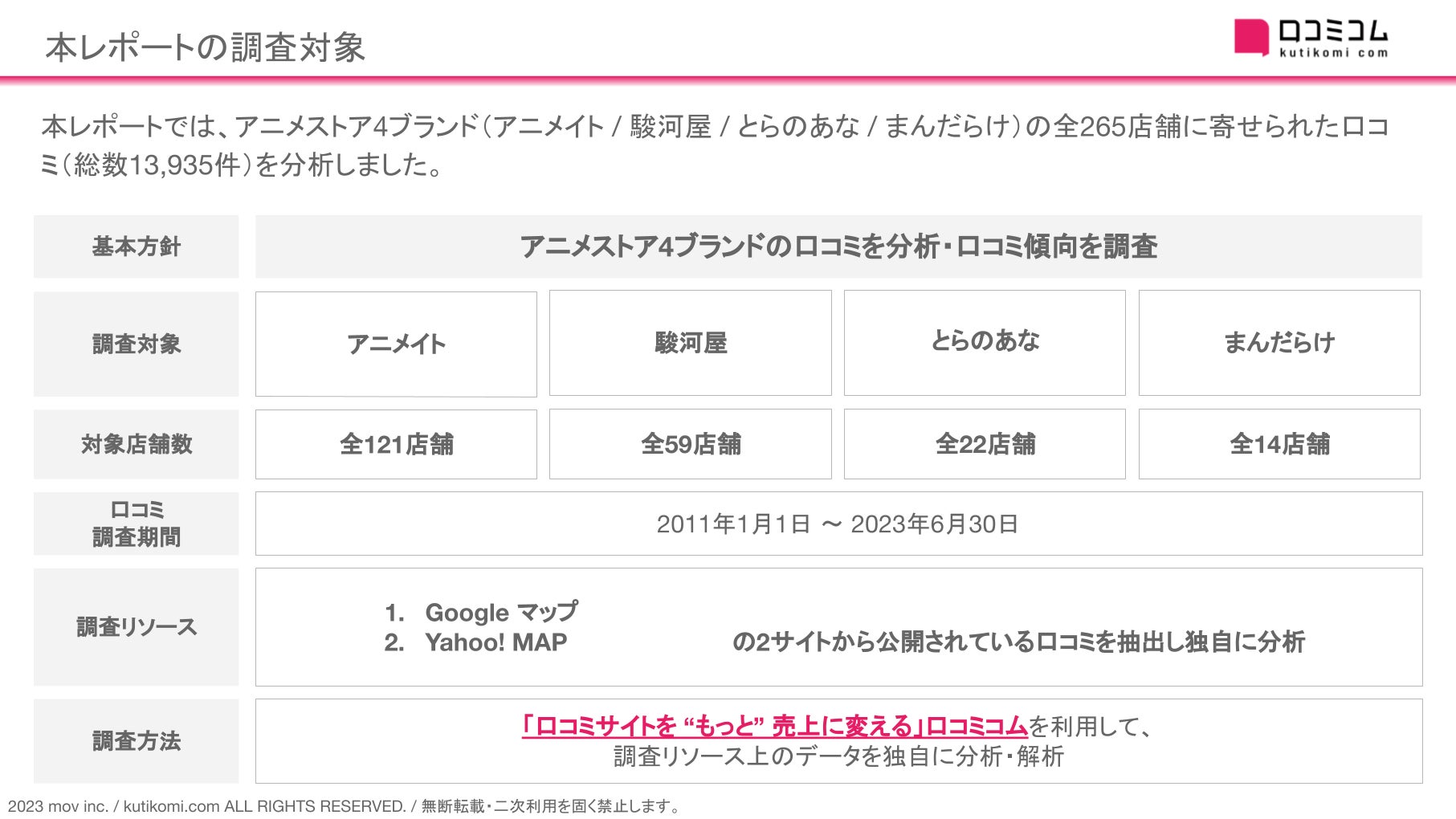 今回は、アニメストア4ブランド(アニメイト / 駿河屋 / とらのあな / まんだらけ)の全265店舗に寄せられた口コミ(総数13,935件)を分析しました。