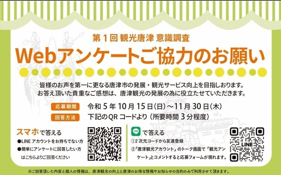 唐津市では、皆様の声を第⼀に更なる唐津市の発展・観光サービス向上を⽬指しております。お答え頂 いた貴重なご感想は、唐津観光の発展の為に役⽴たせていただきます。