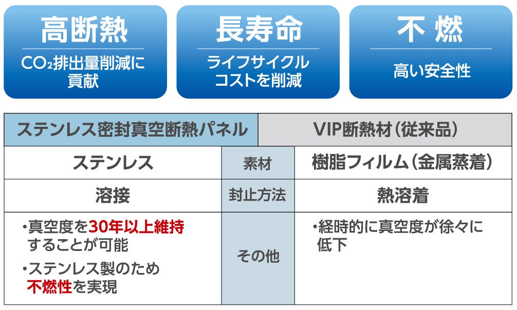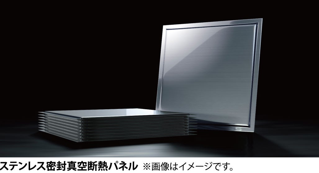 さらに、ステンレス素材を使用して、魔法瓶の真空断熱技術をパネル化することで、従来の真空断熱材では得られなかった不燃性と高断熱性の長期間維持が可能に。