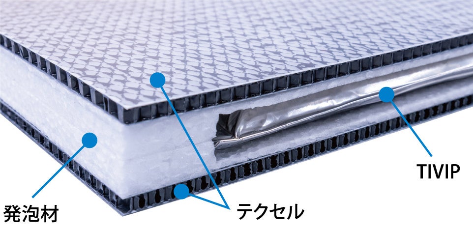 大阪・関西万博内での活用においては、当社が新開発したステンレス密封真空断熱パネル「TIVIP」を岐阜プラスチック工業の軽量・高強度素材である樹脂製ハニカムパネル「テクセル」でサンドイッチすることで、TIVIPを保護し軽量かつ強固な断熱ユニットパネルとなっております。