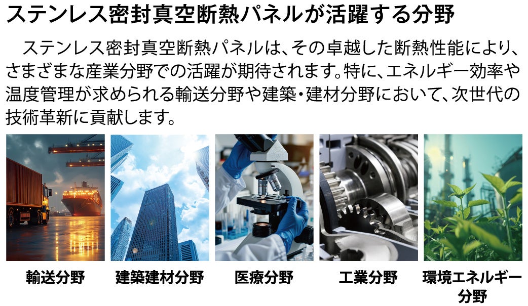 ステンレス密封真空断熱パネルは、輸送用の保冷コンテナや建築資材に活用することで温度維持に必要な電気エネルギーの使用を抑えることができ、CO2削減に貢献する環境に配慮した持続可能な資材です。