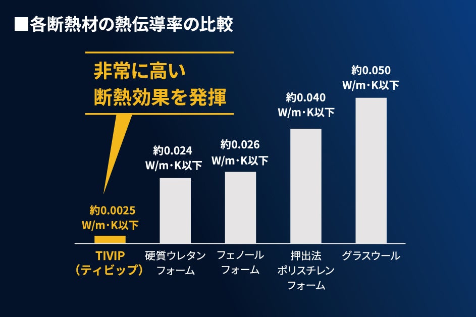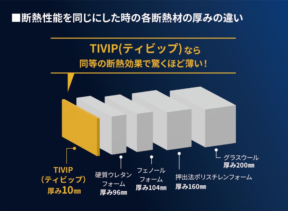 ※厚み10mm、サイズ440mm角以上のTIVIPの試作品の熱抵抗R=0.01/0.0025=4.00㎡K/W、厚み100mm、サイズ440mm角以上の硬質ウレタンフォームの熱抵抗R=0.1/0.024=4.16㎡K/W