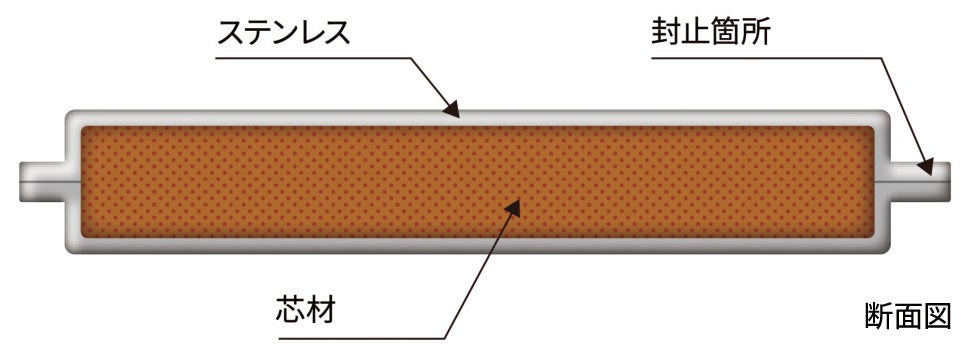 二重にしたステンレス箔の内側を真空状態にし、断熱性能を高めた断熱材です。さらに、形状を保つために芯材となる素材を中に入れて封止しています。
