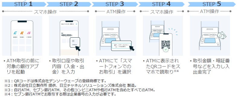 本サービスは、ATMに表示されたQRコード※1を各行のアプリで読み取り、ATMでキャッ シュカードの暗証番号等を入力することで、手元に通帳やキャッシュカードがなくてもスマートフォンだけで簡単に現金の入出金ができるサービスです。