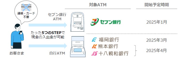 2025年1月にセブン銀行ATMで、同年3月および4月に福岡銀行、熊本銀行、十八親和銀行の自行ATM※2で本サービスをご利用いただける予定です。本件により、自行ATM約2,000台と全国のセブン銀行ATM約27,000台において、日常利用や旅行・出張先など様々なシーンで アプリを利用した現金の入出金取引が可能になります。