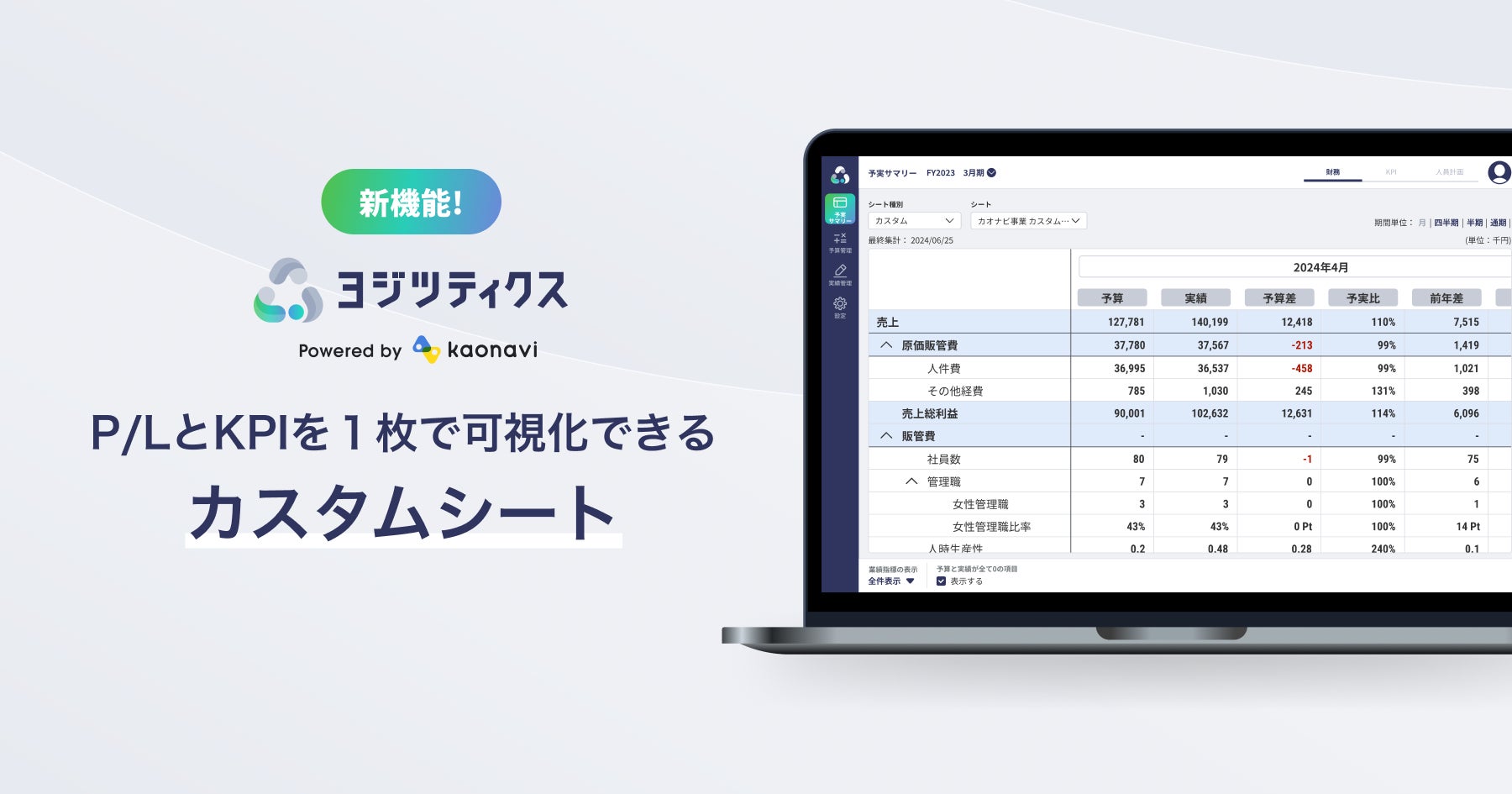 株式会社カオナビ(本社:東京都渋谷区、代表取締役社長CEO:佐藤 寛之)が提供する予実管理システム「ヨジツティクス」は、従来のP/L(財務数値)とKPI(非財務指標)を、1枚のシートで可視化できる「カスタムシート」を2026年2月12日(木)に提供開始します。