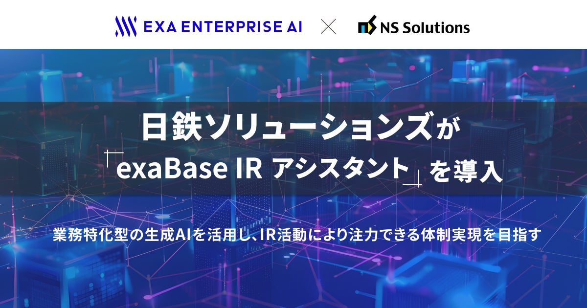 株式会社エクサウィザーズのグループ会社である株式会社Exa Enterprise AI(東京都港区、代表取締役:大植 択真、以下Exa Enterprise AI)は、日鉄ソリューションズ株式会社(以下NSSOL)が当社の「exaBase IRアシスタント」の導入を開始したことをお知らせします。NSSOLの管理本部IR部は、業務特化型の生成AIを活用し、担当者の業務DXを推進し、付加価値の高い情報開示へと注力できる体制の実現を図ります。エクサウィザーズとNSSOLは2023年5月に業務提携契約を締結し、両社の有する顧客基盤や営業戦略、顧客業務に関するドメイン知見、デジタル及びAI領域における技術力などを相互に活かし、様々な取り組みを行っています。