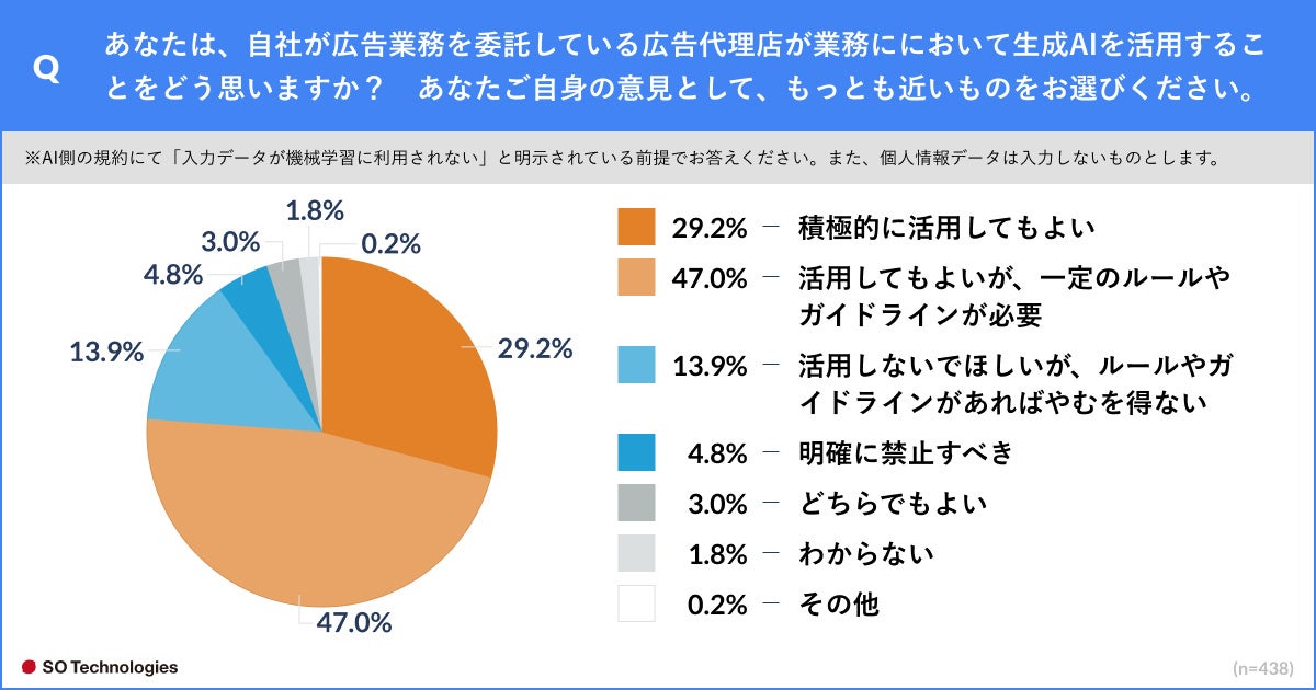 委託先の広告代理店が生成AIを活用することをどう思うかについて、回答者自身の考えにもっとも近いものを聞いたところ、「活用してもよいが、一定のルールやガイドラインが必要」が最多で47.0%、次いで「積極的に活用してもよい」が29.2%となり、76.2%が肯定的な意見となった。