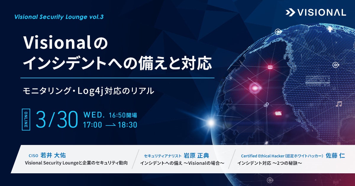 このたび3回目となる「Visional Security Lounge」は、「Visionalのインシデントへの備えと対応〜モニタリング・Log4j対応のリアル〜」をテーマに、Visional全体のセキュリティ領域を担う部署より、セキュリティアナリストの岩原、そしてホワイトハッカーの佐藤が登壇します。
