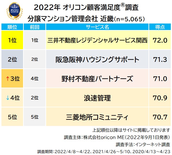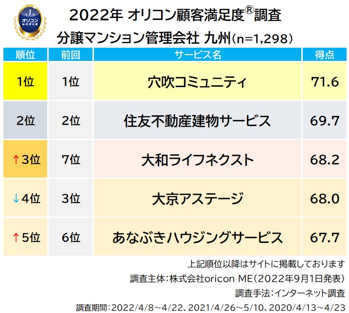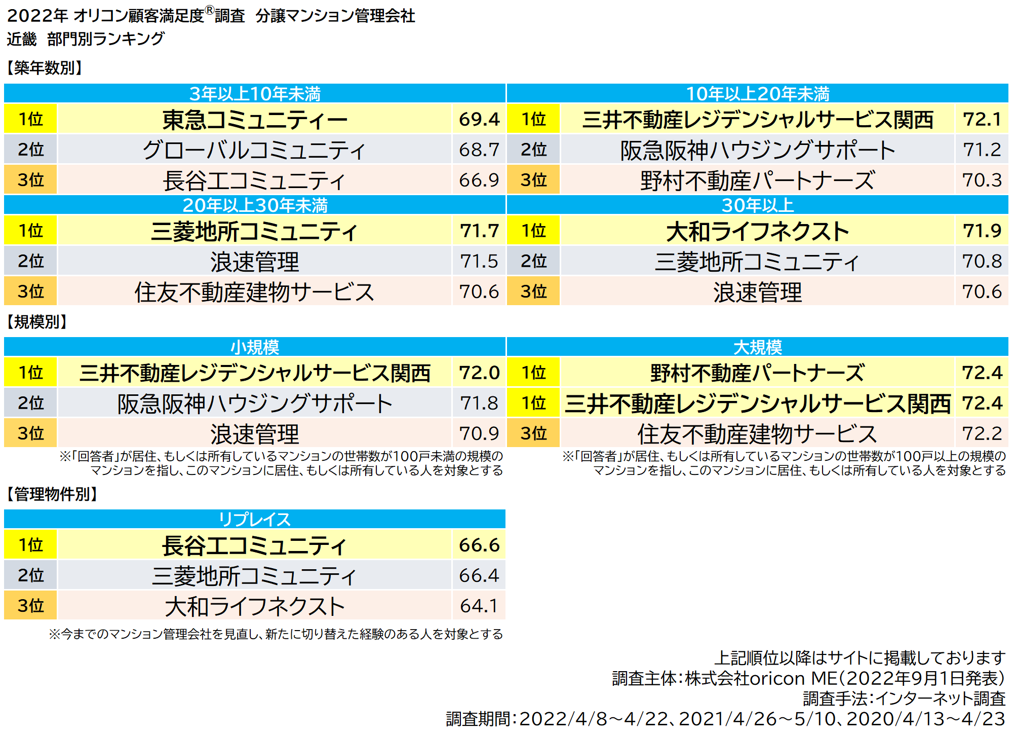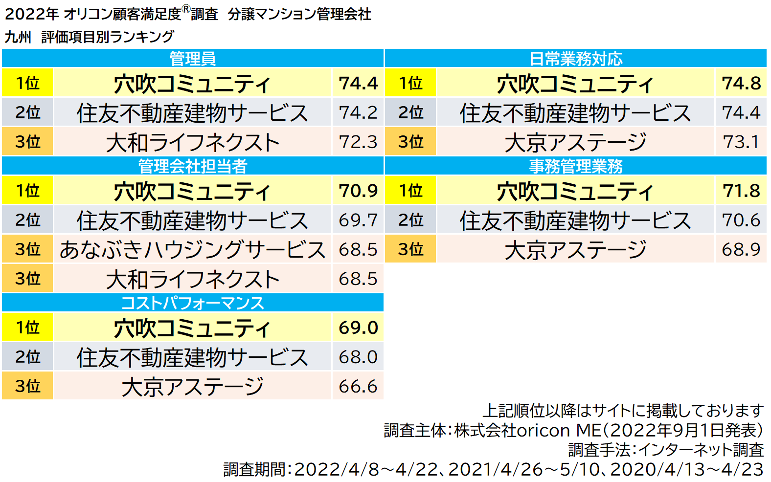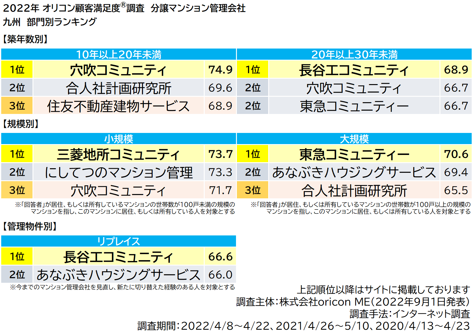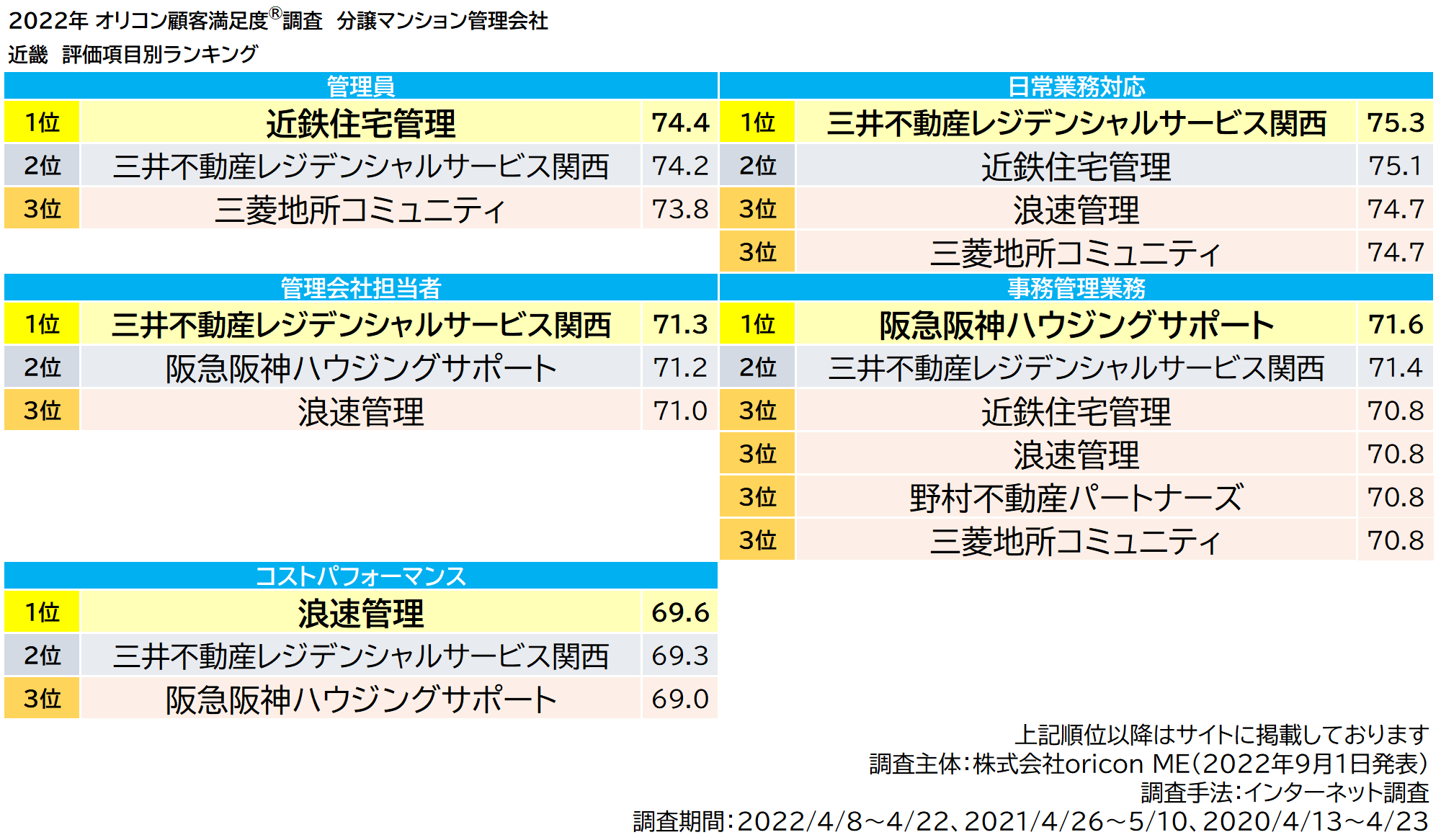 2022年最新『分譲マンション管理会社 近畿/九州』ランキング(オリコン顧客満足度®調査)