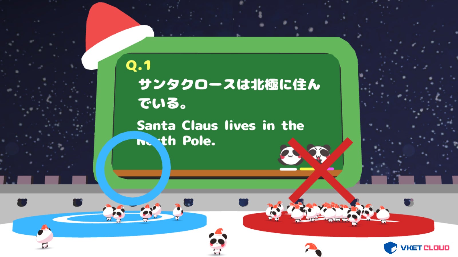 クリスマスにちなんだ◯✕クイズを出題。参加者は◯もしくは✕が記載されたエリアに移動。不正解を選ぶと床が抜けて下に落ちる仕掛けを用意し、メタバース空間ならではのクイズ大会を実施しました。