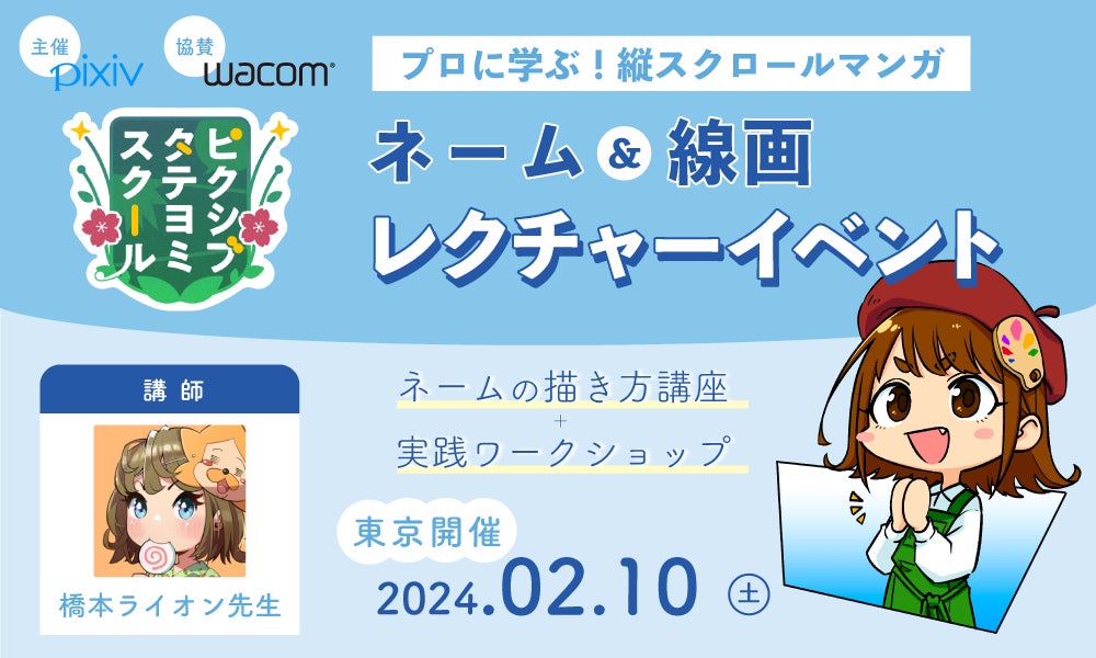本イベントはピクシブが主催する初の縦スクロールマンガワークショップです。「レベルドレインー絶対無双の冒険者ー」などを担当するネーム作家・橋本ライオン氏を講師に迎え、縦スクロールマンガの基礎やプロットの立て方、ネームの描き方、ネームを線画にする際のポイントなどをレクチャーするほか、参加者がレクチャー内容をその場で実践するワークショップを実施します。作品の完成後は、講師がその場で各作品に対する講評を行うなど、参加者の縦スクロールマンガ制作を応援するイベントとなっています。
