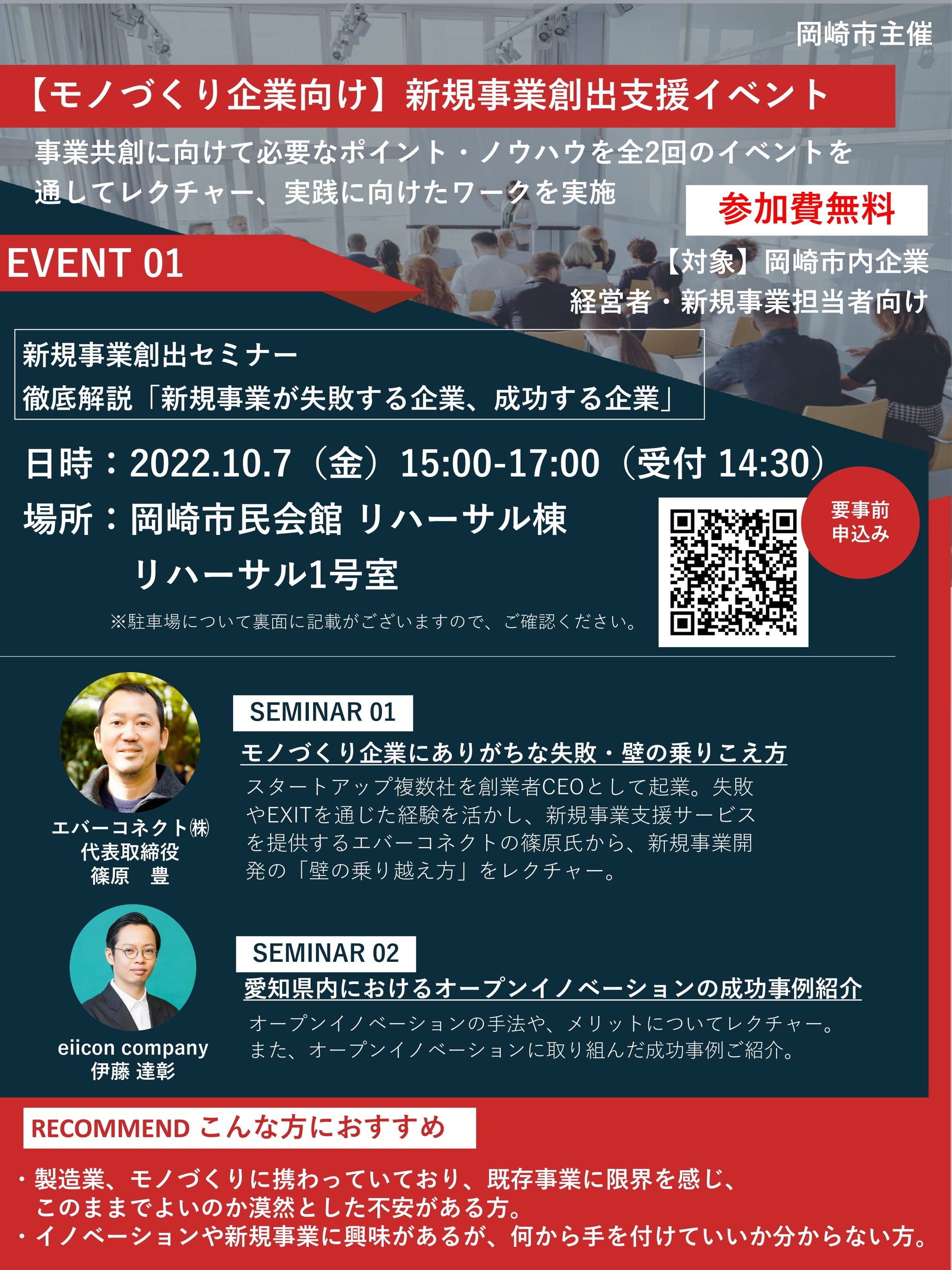 | 新規事業創出セミナー 徹底解説「新規事業が失敗する企業、成功する企業」 セミナー1:モノづくり企業にありがちな失敗・壁の乗りこえ方 セミナー2:愛知県内におけるオープンイノベーションの成功事例紹介 日時:2022年10月7日(金) 15:00-17:00(受付 14:30) 会場:岡崎市民会館 リハーサル棟 リハーサル1号室 参加対象:岡崎市内企業経営者・新規事業担当者 参加費:無料(先着順) 詳細・申込URL: https://forms.gle/fKhJApbtiBLEAyaf9 主催:岡崎市(運営:eiicon company) |