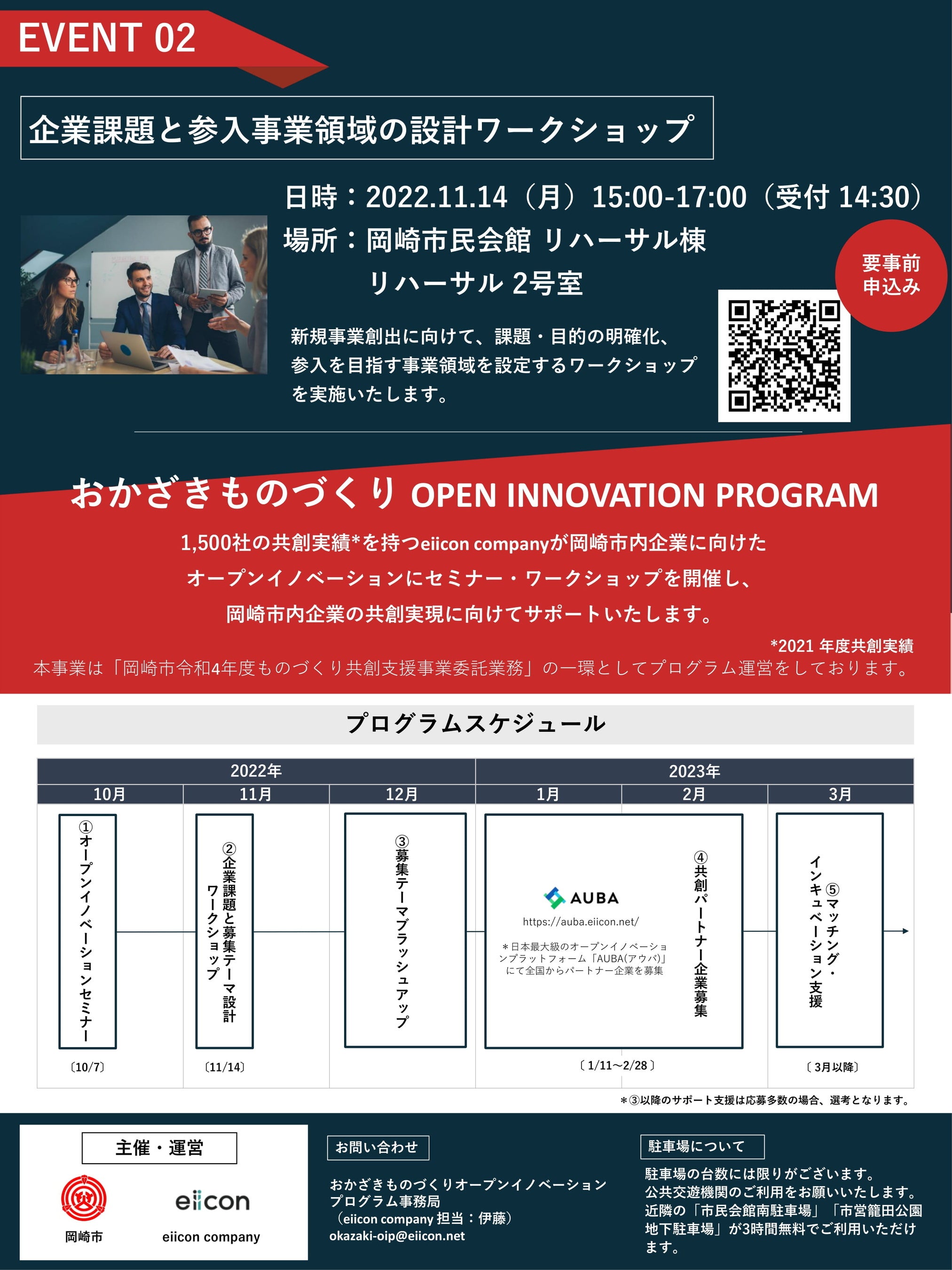 | 企業課題と参入事業領域の設計ワークショップ 日時:2022年11月14日(月) 15:00-17:00(受付 14:30) 会場:岡崎市民会館 リハーサル棟 リハーサル2号室 参加対象:岡崎市内企業経営者・新規事業担当者 参加費:無料(先着順) 詳細・申込URL: https://forms.gle/5TyDmDLEshgT5372A 主催:岡崎市(運営:eiicon company) |